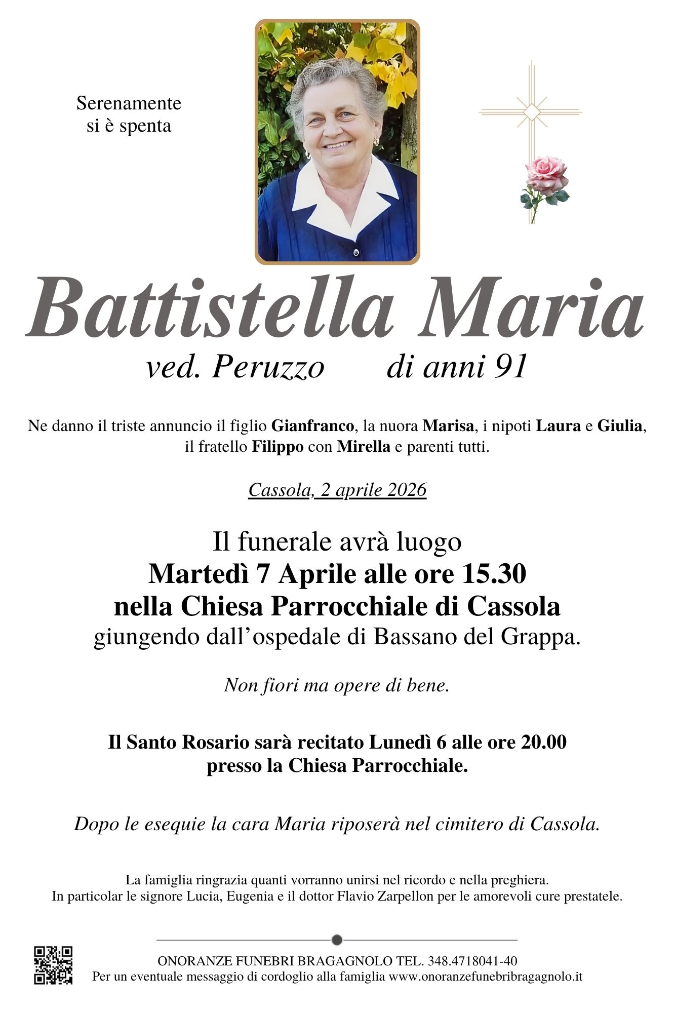 Il funerale avrà luogo Martedì 7 Aprile alle ore 15.30 nella Chiesa Parrocchiale di Cassola giungendo dall’ospedale di Bassano del Grappa.