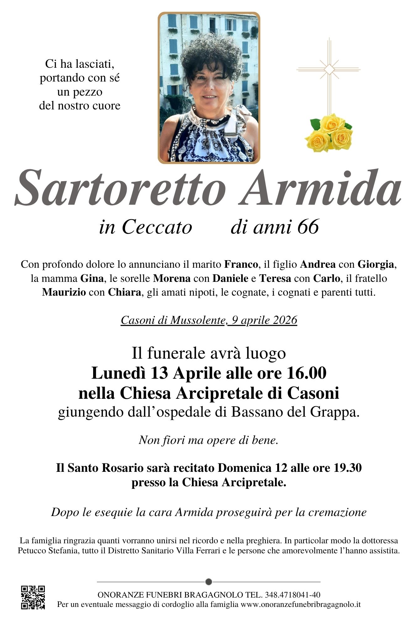 Il funerale avrà luogo Lunedì 13 Aprile alle ore 16.00 nella Chiesa Arcipretale di Casoni.