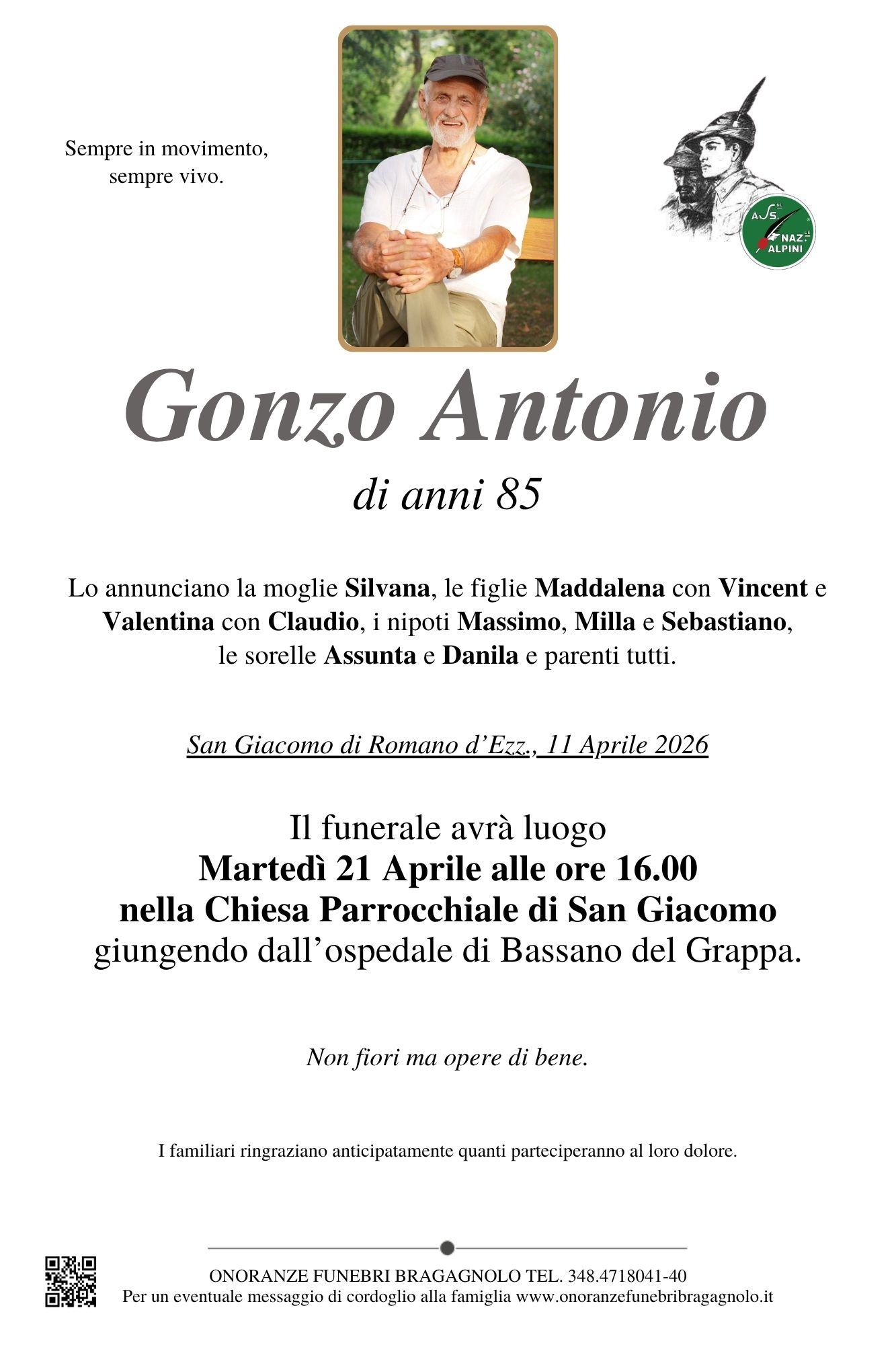 Il funerale avrà luogo Martedì 21 Aprile alle ore 16.00 nella Chiesa Parrocchiale di San Giacomo.