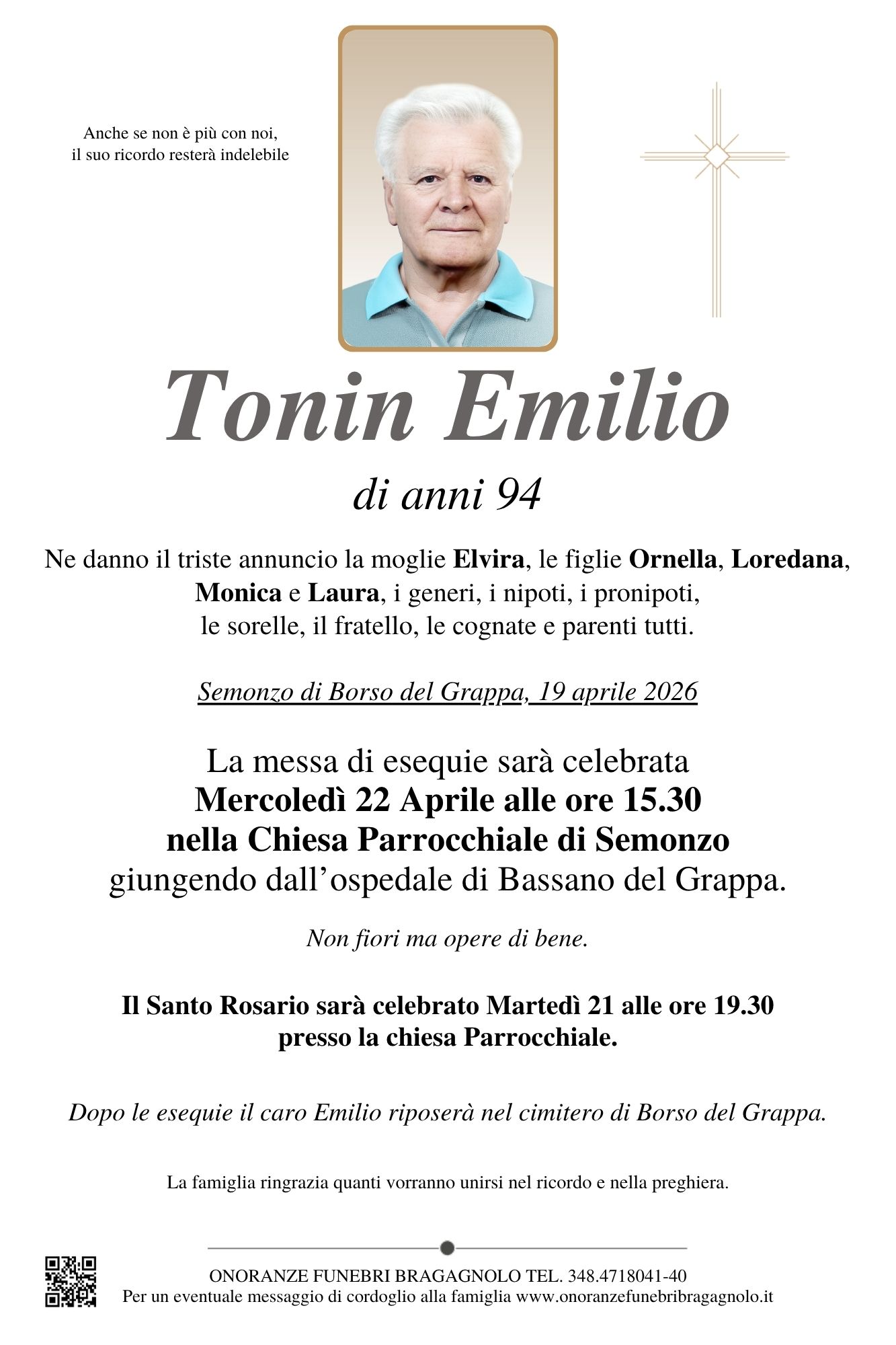 La messa di esequie sarà celebrata Mercoledì 22 Aprile alle ore 15.30 nella Chiesa Parrocchiale di Semonzo.